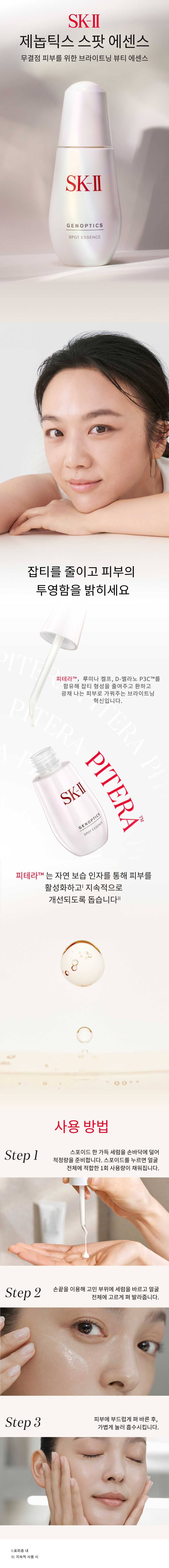 최적의 한 방울을 선사하는 오토필 스포이드를 사용하여 에센스를 손바닥에 떨어뜨린 후 얼굴 전체에 골고루 펴발라 주세요. 고민이 있는 부분이 있다면 한 번 더 덧발라 주세요.